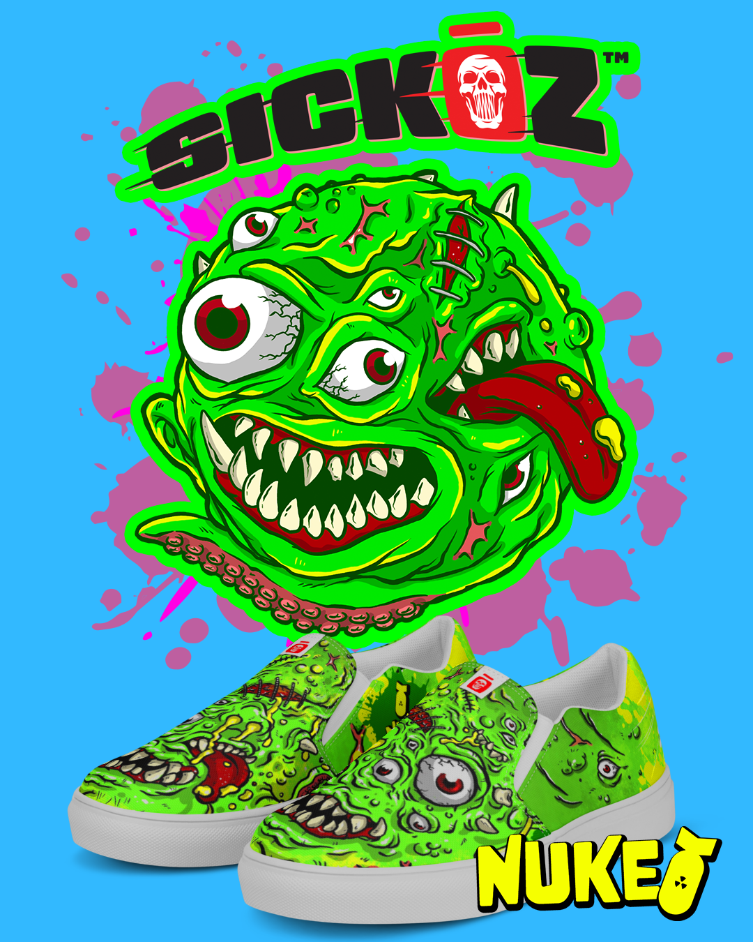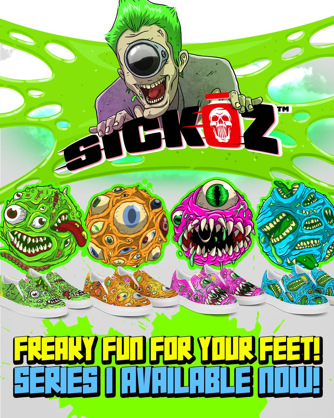 Sickoz is a brand built around a playful obsession with 1980s and 1990s toy culture—drawing inspiration from gross-out collectibles, neon packaging, and the irreverent spirit of Garbage Pail Kids. For the brand, I developed a distinctive visual world of humorous, hand-illustrated characters and warped iconography that balances nostalgia with modern design sensibilities. The result was a unique, interactive line of “toys for your feet,” transforming footwear and merchandise into collectible, customizable pieces designed to be played with as much as they’re worn.